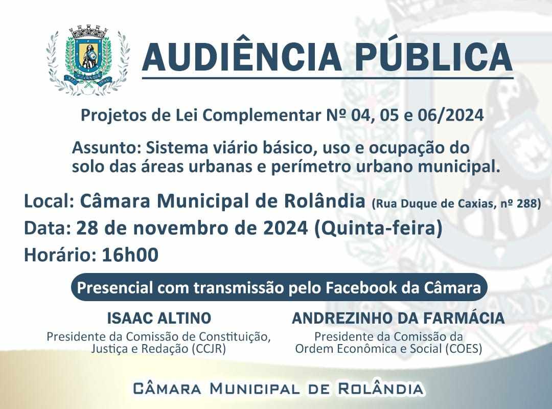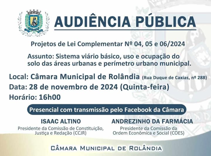 AUDIÊNCIA PÚBLICA: ESTACIONAMENTO ROTATIVO   O MUNICÍPIO DE ROLÂNDIA/PR, por intermédio do Conselho Gestor de Parceria Público Privadas, no uso de suas prerrogativas, em observância ao artigo...