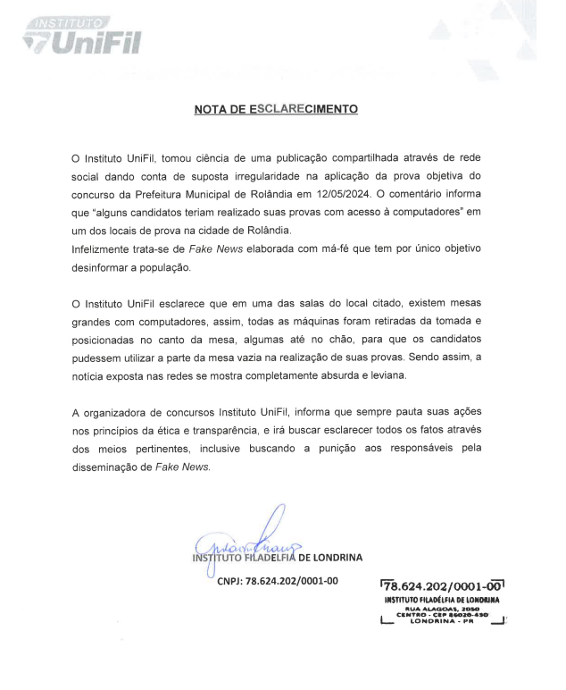 INSTITUTO UNIFIL  - NOTA DE ESCLARECIMENTO SOBRE O CONCURSO PÚBLICO DA PREFEITURA DE ROLÂNDIA Confira documento assinado por Gislaine Araújo. O Instituto Unifil é a banca que aplicou a prova do Concurso Públic...