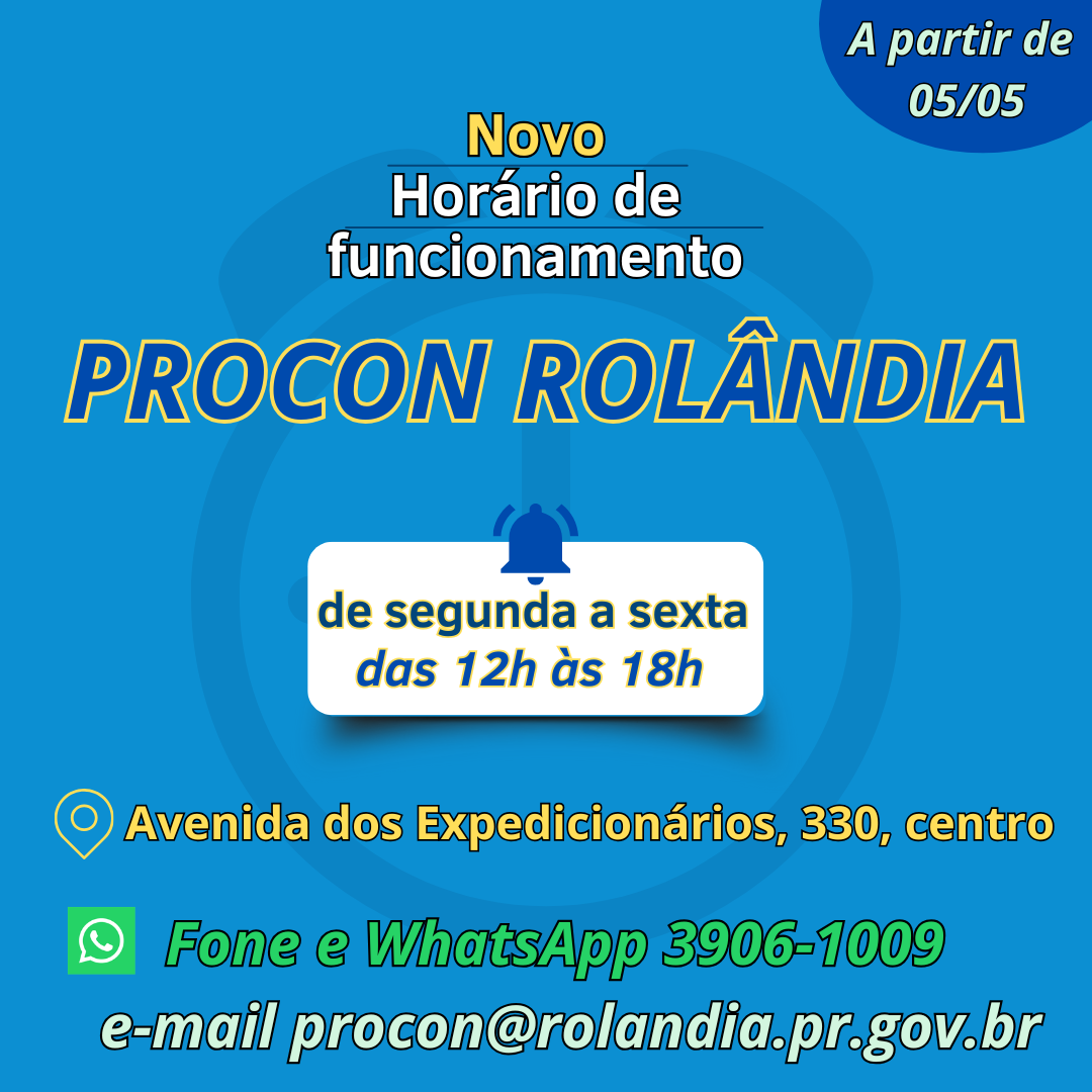 NOVO HORÁRIO DE ATENDIMENTO DO PROCON   O PROCON Rolândia informa o novo horário de atendimento do órgão.   Agora, o atendimento acontece de segunda a sexta, das 12h às 18h, alinhando o hor...