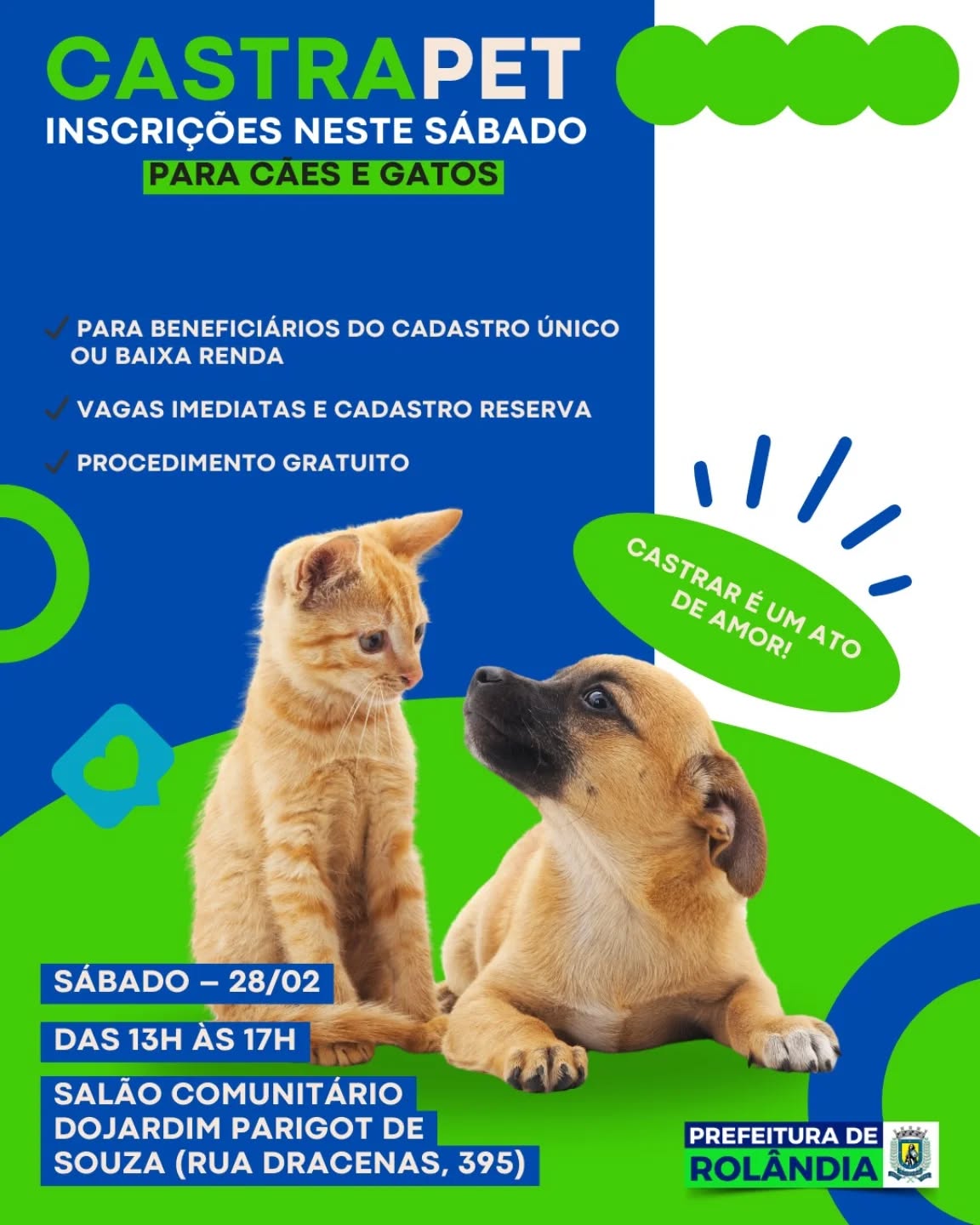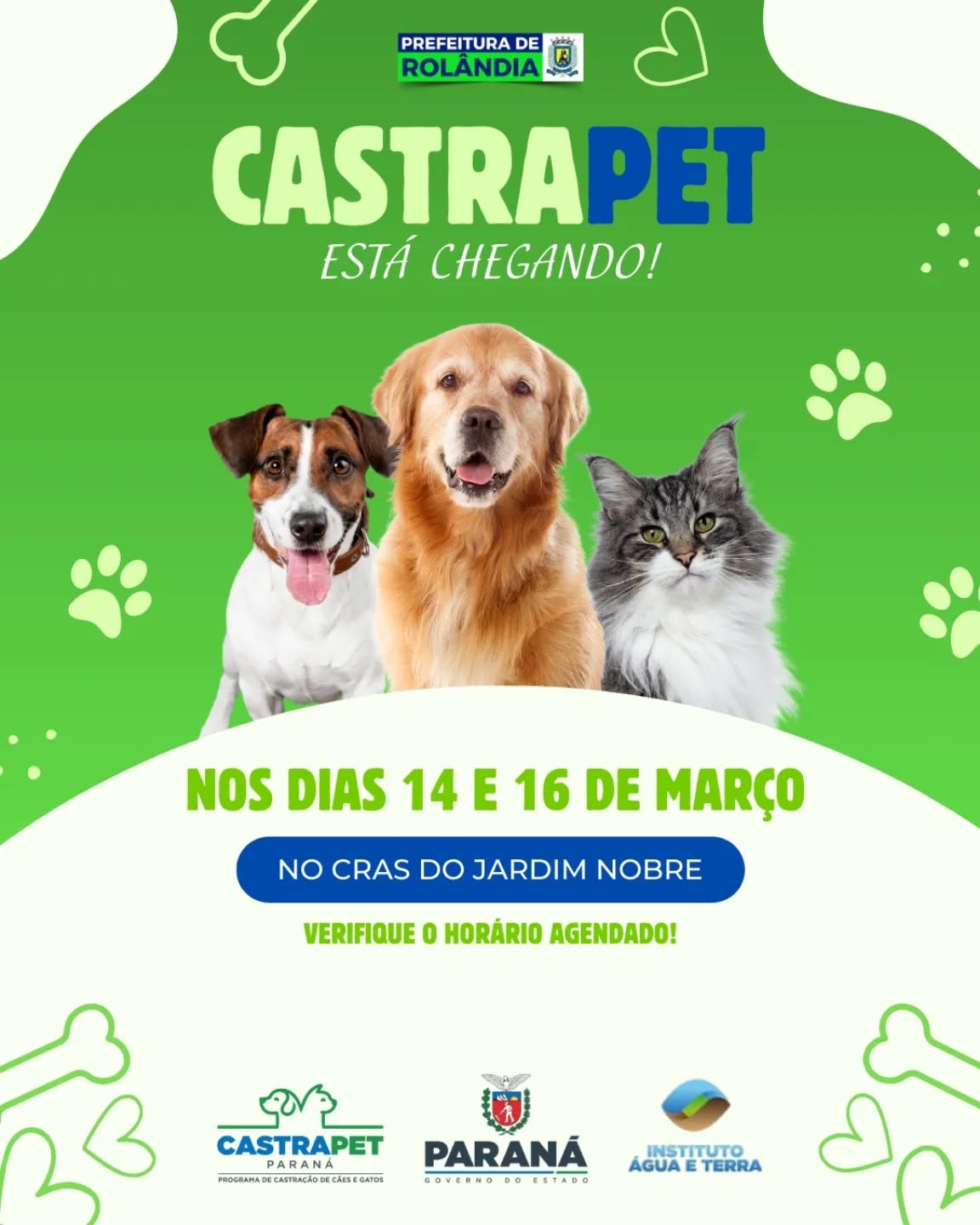 CASTRAPET ESTADUAL EM ROLÂNDIA COM TODAS AS VAGAS PREENCHIDAS; AÇÃO ACONTECE NOS DIAS 14 E 16 DE MARÇO O Programa Permanente de Esterilização de Cães e Gatos (CastraPet Paraná), coordenado pel...