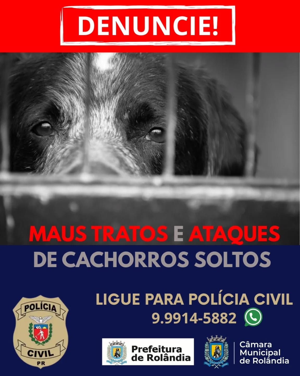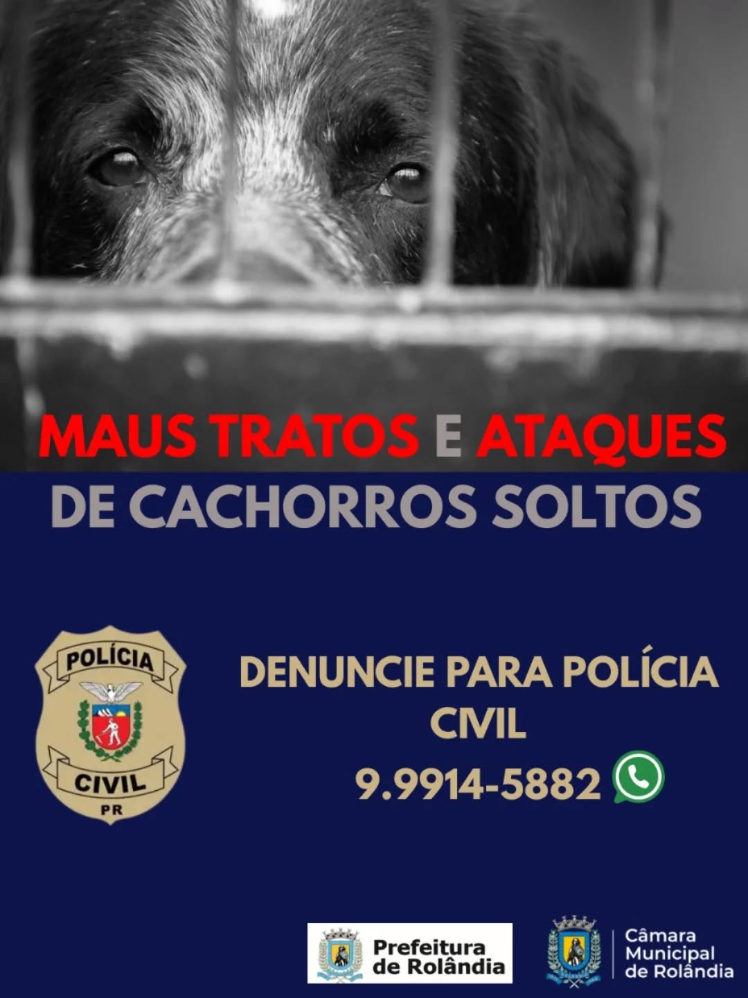 Prefeitura, Câmara e Polícia Civil informam canal de denúncias sobre maus tratos aos animais ou em casos de ataques de cachorros soltos em Rolândia!   Parceria da secretaria de Agricultura e Meio Ambiente, verea...
