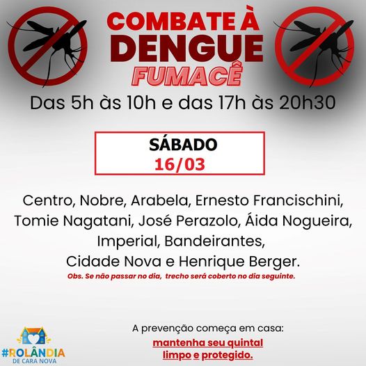 A secretaria de Saúde por meio do setor de Endemias intensifica os trabalhos de mutirão contra a dengue no município de Rolândia. Nesta sexta-feira (15) os trabalhos foram realizados nos bairros Capricórnio, Campo B...
