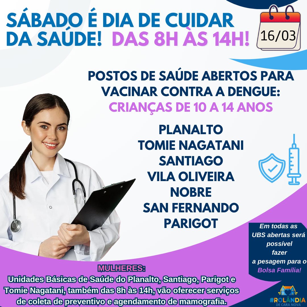 Recado da secretaria de Saúde, para este sábado, dia 16/03. Em todas as Unidades Básicas de Saúde da área urbana (menos Bartira e São Martinho) haverá vacina contra a dengue para crianças de 10...