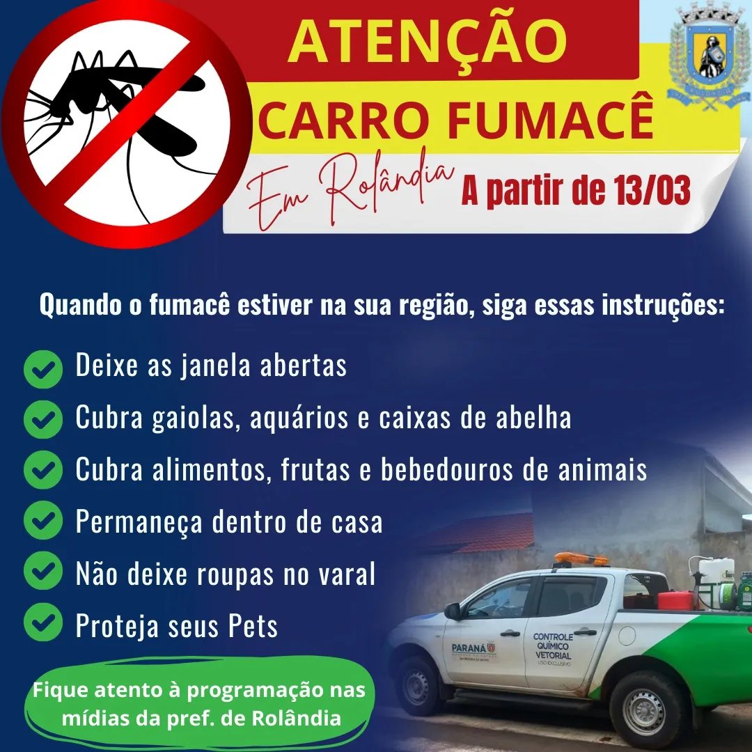 FUMACÊ EM ROLÂNDIA COMEÇA NESTA QUARTA-FEIRA A secretaria municipal de Saúde comunica que os veículos aspergindo o fumacê vão iniciar a operação no fim da tarde desta quarta-feira, dia 13...