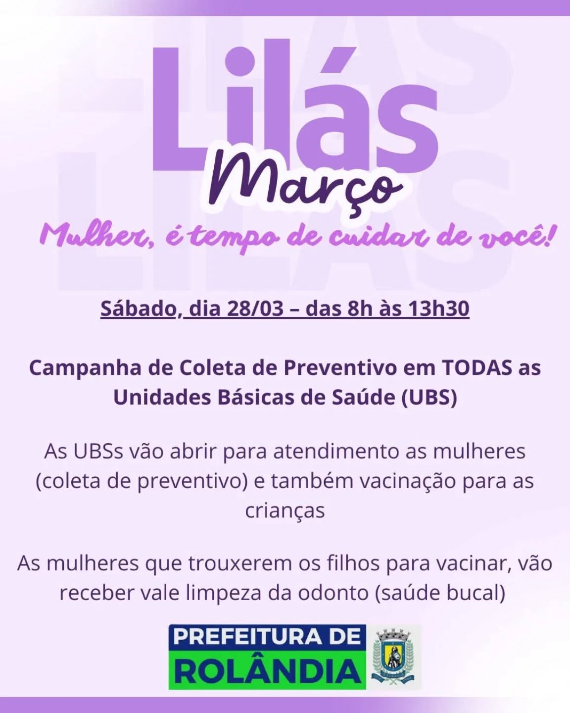 Todas as Unidades Básicas de Saúde (UBS) abrem neste sábado, em ação do “Março Lilás” O “Março Lilás” é uma campanha dedicada ao mês da mulher, foc...
