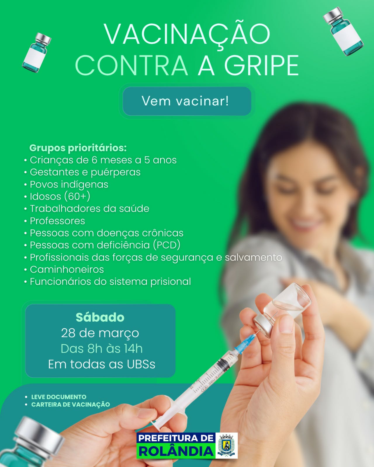 Vacinação contra a gripe começa neste sábado! Unidades Básicas de Saúde atenderão das 8h às 14h! A secretaria de Saúde convida a população a receber a dose da vacina c...