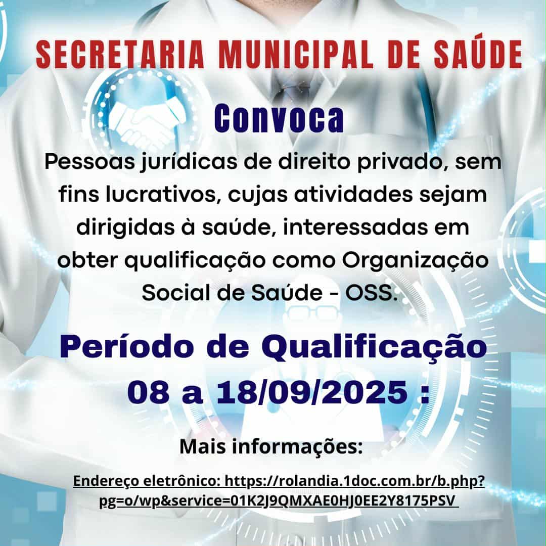 EDITAL DE QUALIFICAÇÃO DE ORGANIZAÇÃO SOCIAL DE SAÚDE N.° 001/2025 – SECRETARIA MUNICIPAL DE SAÚDE   Mais informações em https://rolandia.1doc.com.br/b.php?pg=o/dados_serv...