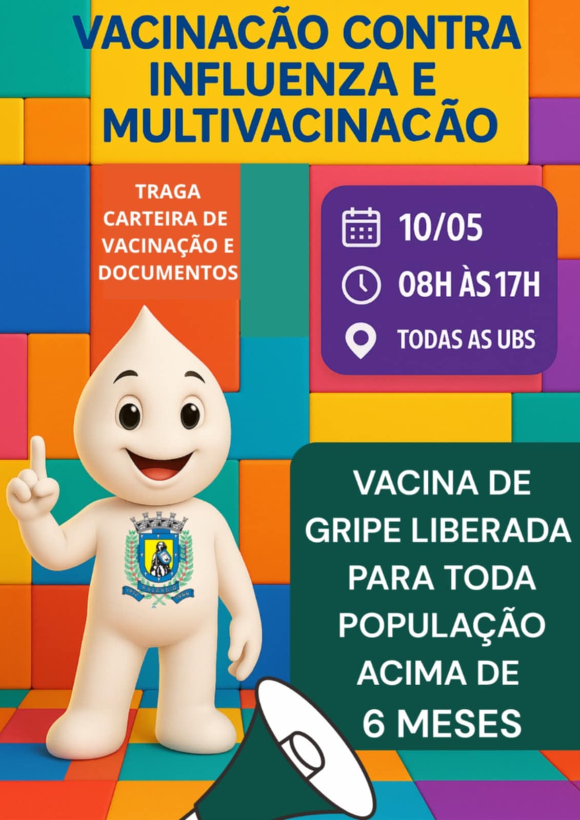 NO SÁBADO, VACINAÇÃO CONTRA A GRIPE LIBERADA PARA QUEM TEM ACIMA DE SEIS MESES DE VIDA! E AINDA ATUALIZAÇÃO DAS DEMAIS VACINAS!   A secretaria de Saúde informa que neste sábado, dia 10...