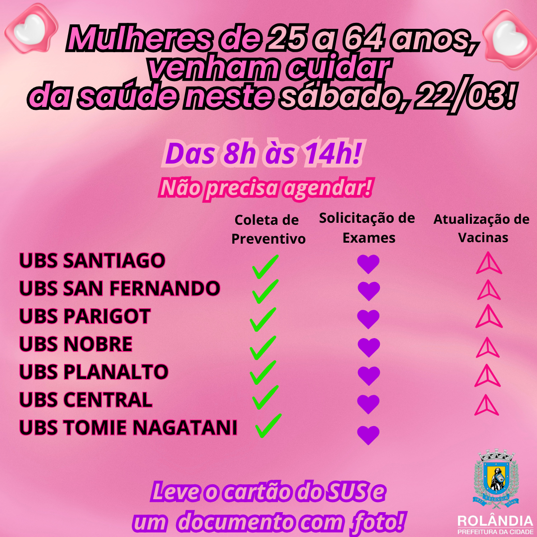 Mulheres, sábado é dia de cuidar da saúde! Confira a nova programação, da abertura das Unidades Básicas de Saúde, das 8h às 14h! Coleta de preventivo e agendamento de mamografias, al...