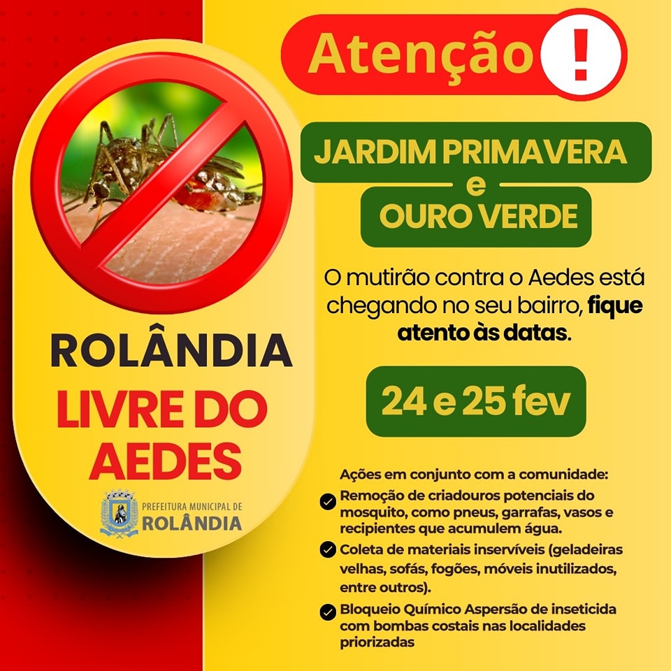 Rolândia unida contra a dengue!   A secretaria de Saúde promove, nesta segunda e terça, um mutirão contra o Aedes aegypti no Jardim Primavera e Ouro Verde.   Entre os dias 26 e 28 de fevereiro, a mob...