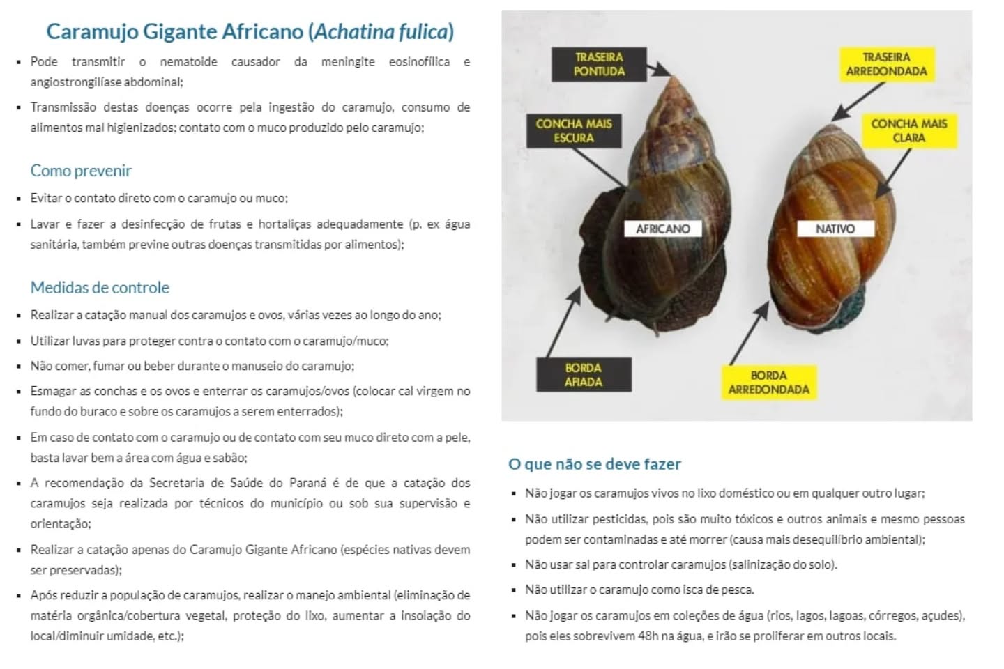 Caramujo africano: informes importantes Secretaria de Saúde apresenta material educativo sobre o animal. Denúncias ou dúvidas: Ligue (43) 3906-1126. ...