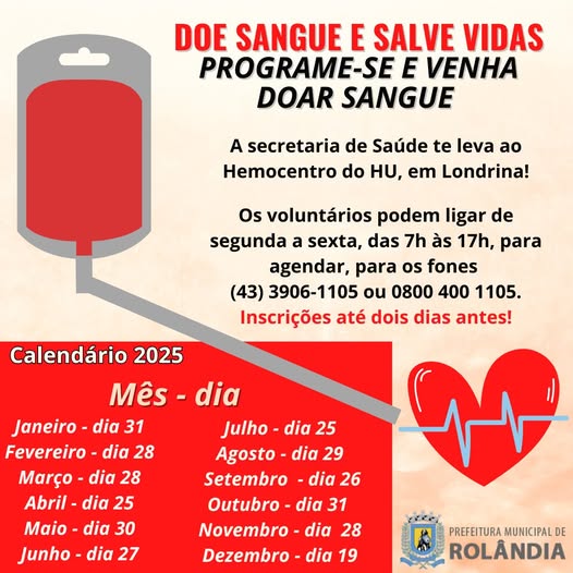 QUER DOAR SANGUE? A SECRETARIA DE SAÚDE TE LEVA!   A secretaria de Saúde e o Hemocentro do HU, de Londrina, firmaram uma parceria para que os rolandenses possam doar sangue e ajudar a salvar vidas.   Os voluntá...