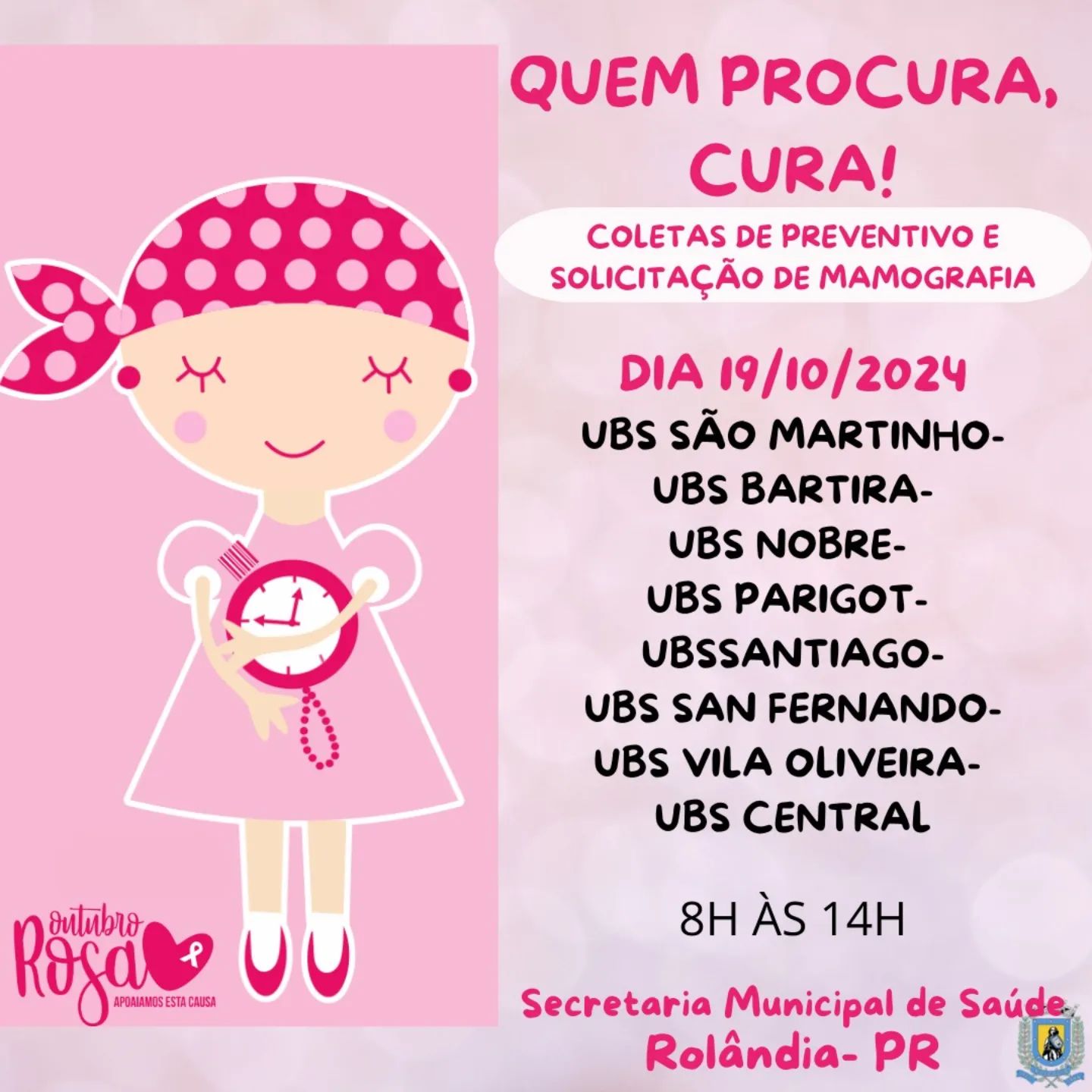 Mulher, venha cuidar da saúde! Neste sábado, dia 19 de outubro, a secretaria de Saúde informa que oito Unidades Básicas de Saúde de Rolândia vão abrir das 8h às 14h, para atender as mulheres, de...
