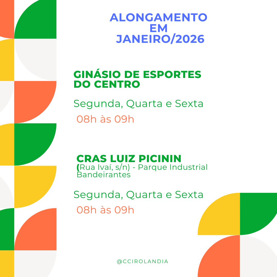 ALONGAMENTO PARA IDOSOS A secretaria de Assistência Social, por meio do Centro de Convivência dos Idosos (CCI) comunica que no mês de janeiro de 2026 haverá aula de alongamento, ministrada pela secretaria de Esportes. A...