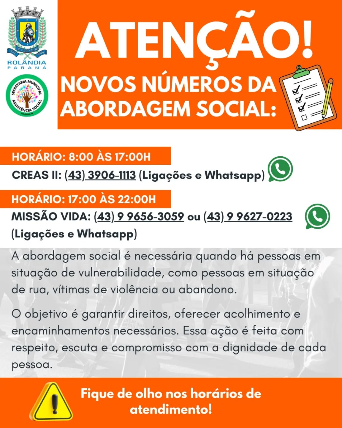 Novos números para acionar a Abordagem Social   Serviço ofertado pela secretaria de Assistência Social e pela Missão Vida.   O Serviço Especializado em Abordagem Social é ofertado de forma cont...