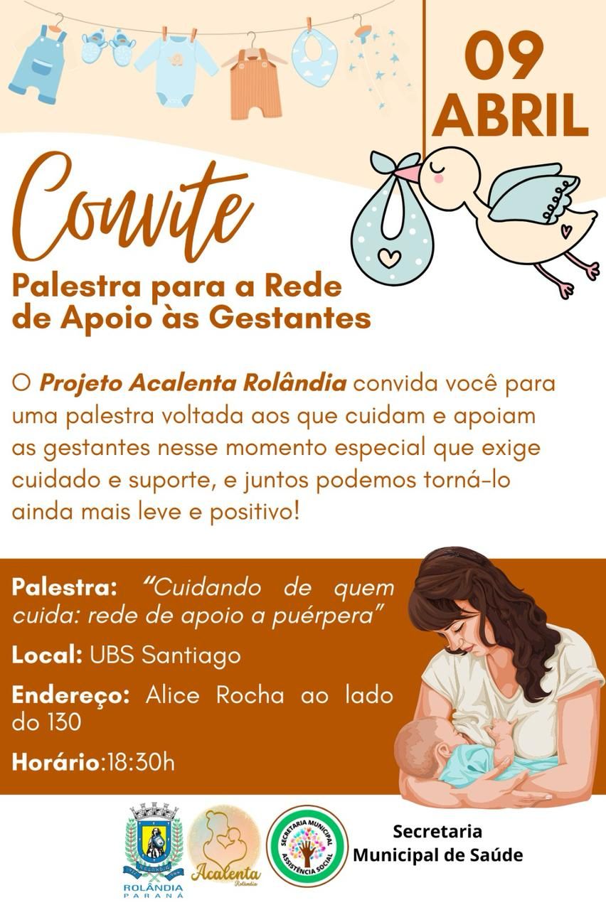 PALESTRA PARA AS GESTANTES E FAMILÍAS   As secretarias de Assitência Social e de Saúde convidam para uma palestra gratuita, no dia 9 de abril, quarta-feira, voltada para a Rede de Apoio às Gestantes.   O...