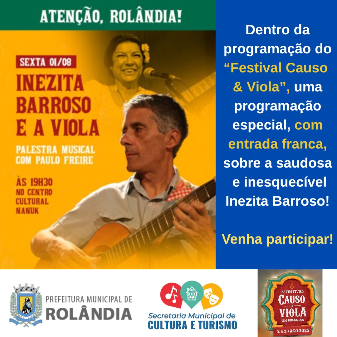 Festival Causo & Viola terá evento gratuito no Centro Cultural Nanuk, sobre Inezita Barroso   Entre os dias 31 de julho e 3 de agosto, violeiros e contadores de causos vão desfilar o talento em Rolândia, com o 6&o...