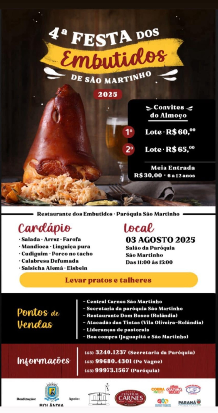 4º Festa dos Embutidos, em São Martinho divulga programação oficial A secretaria de Cultura e Turismo informa que nos dias 2 e 3 de agosto (sábado e domingo), o distrito de São Martinho vai sediar a “4&o...