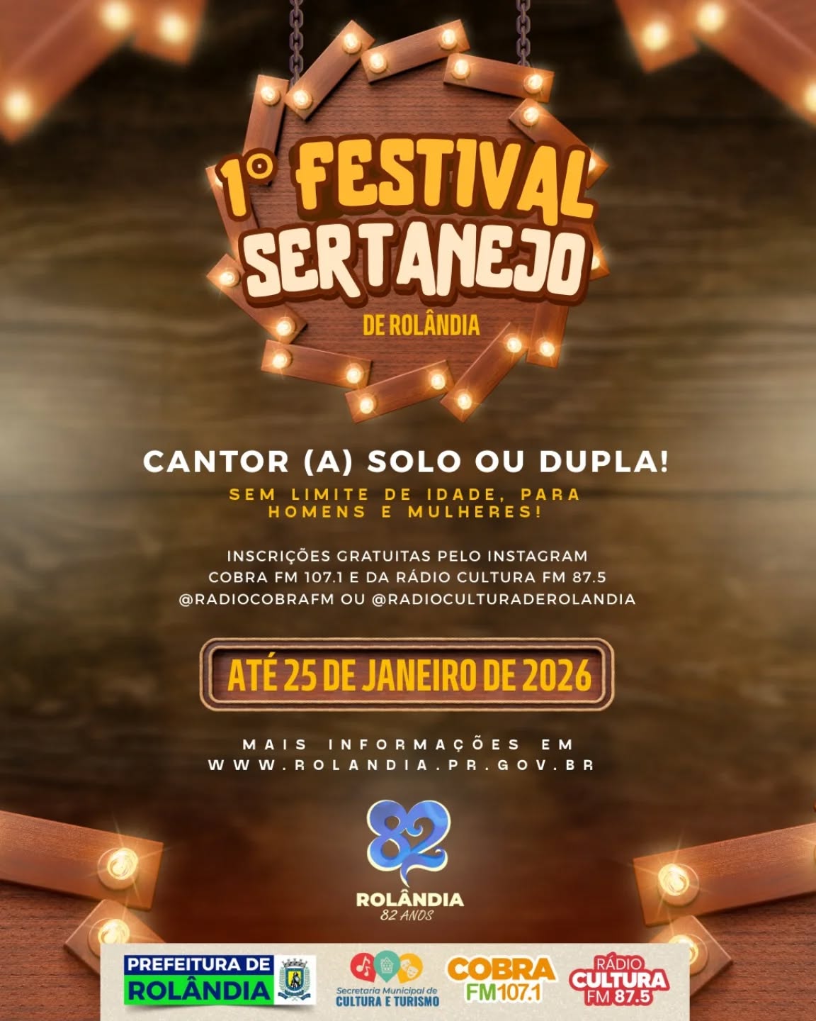 🤠Inscrições abertas para “1º Festival Sertanejo de Rolândia!”🎤   👢A secretaria de Cultura e Turismo e o Grupo Cobra, por meio das rádios Cobra FM 107.1 e Cultura FM 87.5 anunciam o &ldqu...