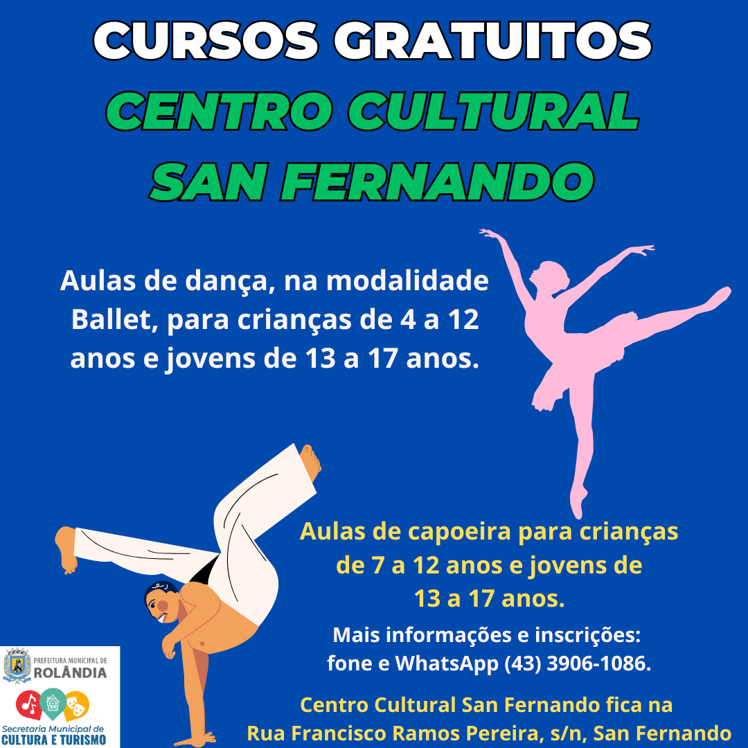 FAÇA SUA INSCRIÇÃO PARA CURSOS GRATUITOS DE BALLET E CAPOEIRA NO CENTRO CULTURAL DO SAN FERNANDO A secretaria de Cultura e Turismo informa que estão abertas as inscrições para cursos gratuitos que são...