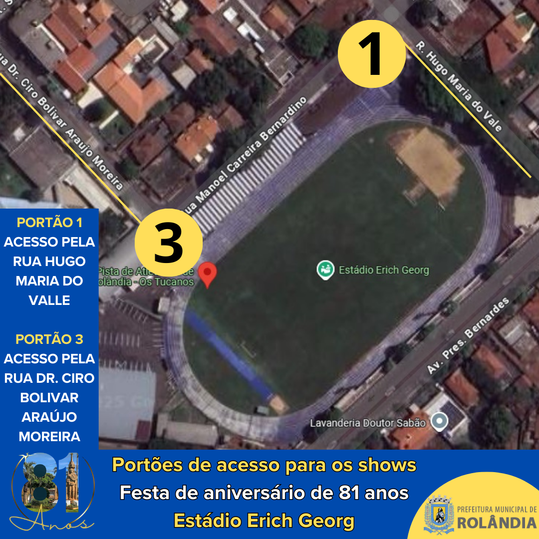 Atenção: para facilitar e agilizar a entrada do público durante os quatro dias de shows, na festa de "81 anos de emancipação de Rolândia", a secretaria de Cultura e Turismo informa que serão dois port...