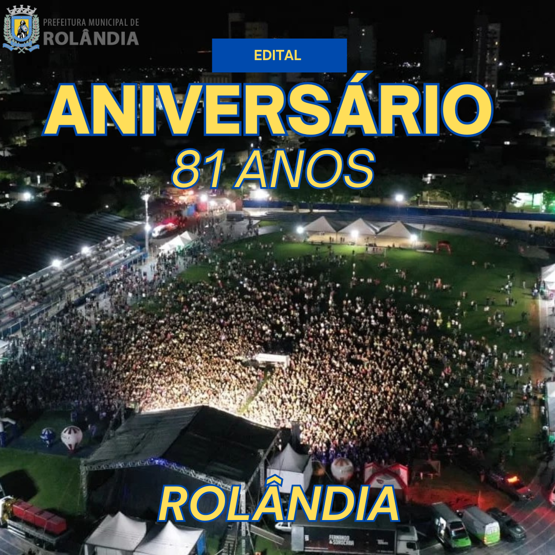 CHAMAMENTO PÚBLICO PARA CONCESSÃO E EXPLORAÇÃO COMERCIAL DE BEBIDAS NAS FESTIVIDADES DO 81ª ANIVERSÁRIO DE ROLÂNDIA A secretaria de Cultura e Turismo informa que a cidade vai ter uma festa de anivers&aac...