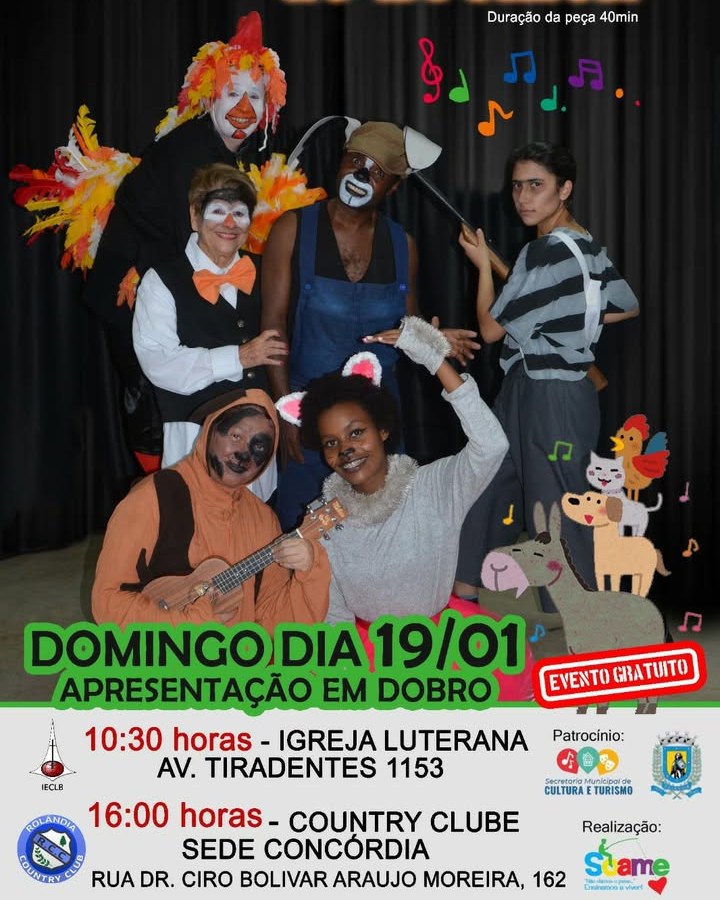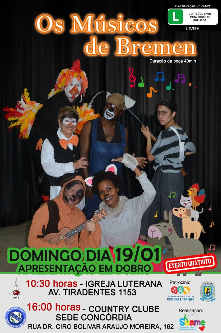 VENHA ASSISTIR O ESPETÁCULO "OS MÚSICOS DE BREMEM"   A secretaria de Cultura e Turismo convida para o espetáculo "Os Músicos de Bremen"!   Classificação livre!   Sinopse   Na...
