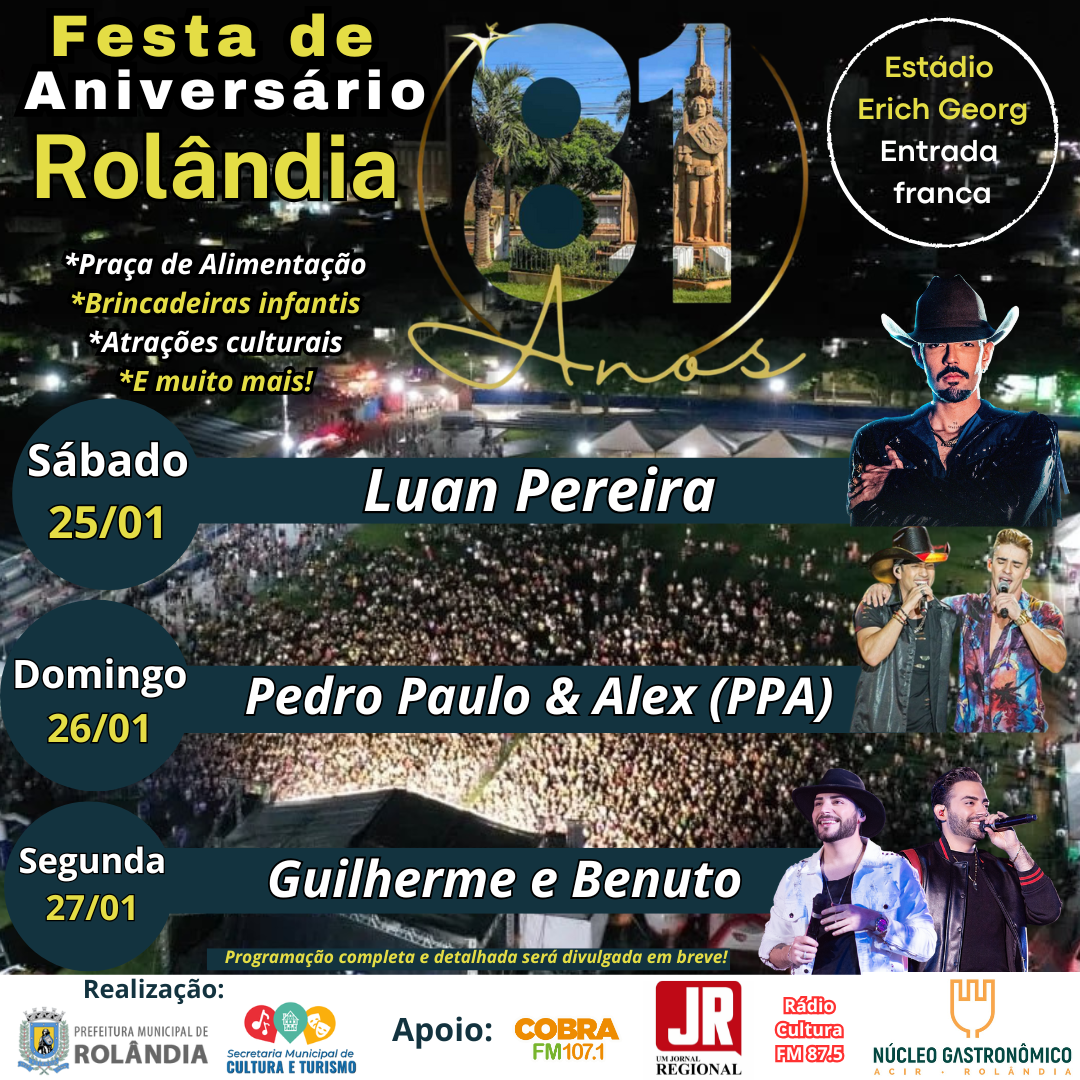 VENHA CELEBRAR O ANIVERSÁRIO DE 81 ANOS DE EMANCIPAÇÃO DE ROLÂNDIA!   A secretaria de Cultura e Turismo divulga o cronograma oficial com as atrações da festa!   Serão quatro dias de ...