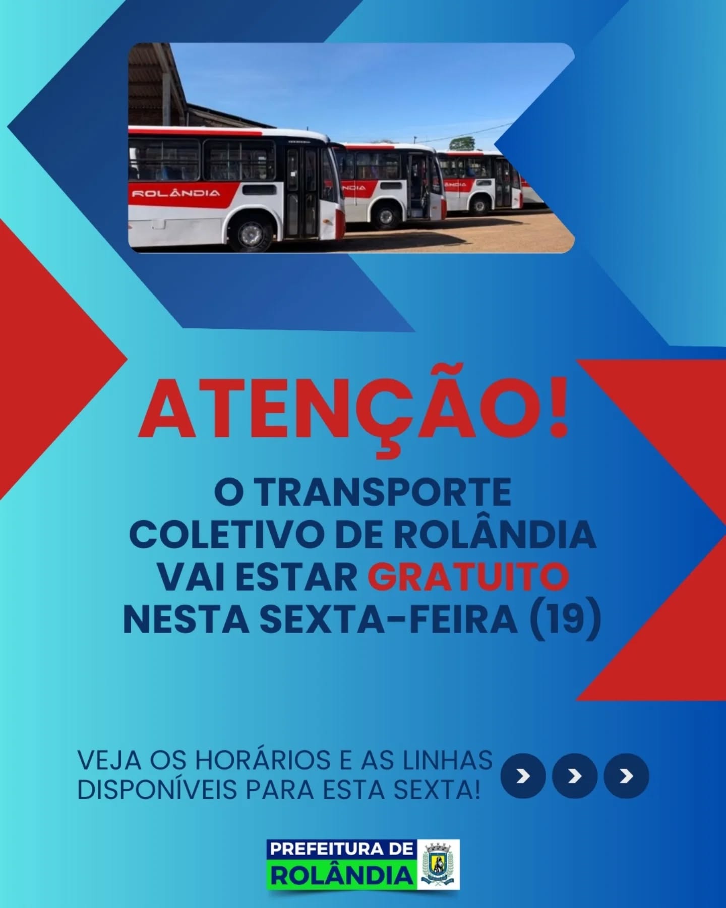 TRANSPORTE COLETIVO EM ROLÂNDIA SERÁ GRATUITO NESTA SEXTA-FEIRA Para estimular o rolandense a comparecer ao show do cantor Fernandinho, o transporte coletivo será gratuito nesta sexta-feira, dia 19 de dezembro. Ônibus ext...